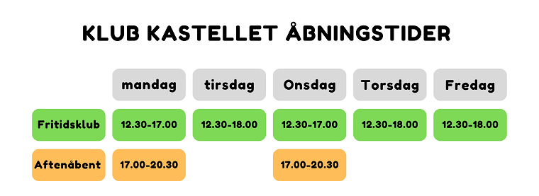 Tirsdag, torsdag og fredag har fritidsklubben åbent fra kl. 12.45-18.00.